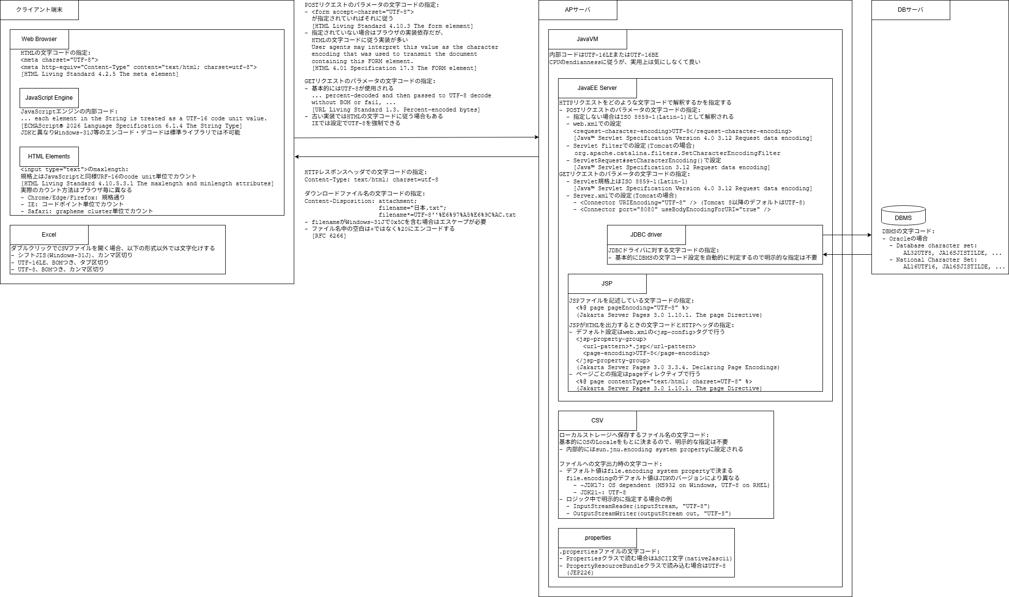 2025-11-24 Java Web3層型アプリケーションにおける文字エンコードの指定箇所 Java Character Encoding Java Web3層型アプリケーションで文字エンコードを指定しそうな箇所をざっと挙げて図にしてみた。 Java Web3層型アプリケーションにおける文字エンコードの指定箇所 元ファイルは以下: Encodings.drawio · GitHub